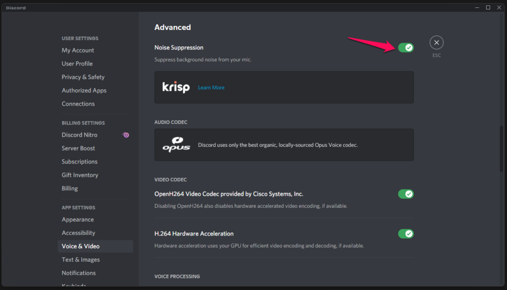 4. Sørg for, at “Noise Suppression” Krisp er deaktiveret.