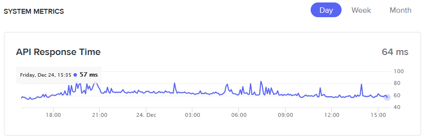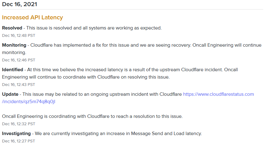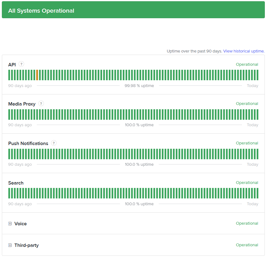 Vi har overvåget Discord siden 12. august 2018. Hvis Discord har systemafbrydelser eller oplever andre kritiske problemer, vises meddelelser med rødt nedad på statussiden. I de fleste tilfælde betyder det, at kernefunktionerne ikke fungerer korrekt, eller at der er en anden alvorlig kundepåvirkende begivenhed i gang.