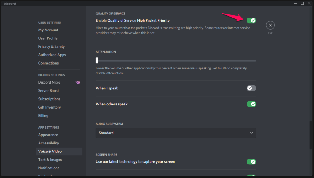 4) Deaktiver Quality of Service (QoS): I nogle tilfælde kan Quality of Service faktisk hæmme ydeevnen i stedet for at hjælpe den, så deaktivering af denne indstilling kan løse problemet for altid. Du kan gøre dette fra Discord-appens indstillinger under “Voice & Video”. Ja, jeg har masser af spillere, der deltager og deltager i spilsamtaler dagligt. Vi er nødt til at notere flere punkter på kontoen, da pakketab er forbundet med din internetforbindelse og selve Discord.