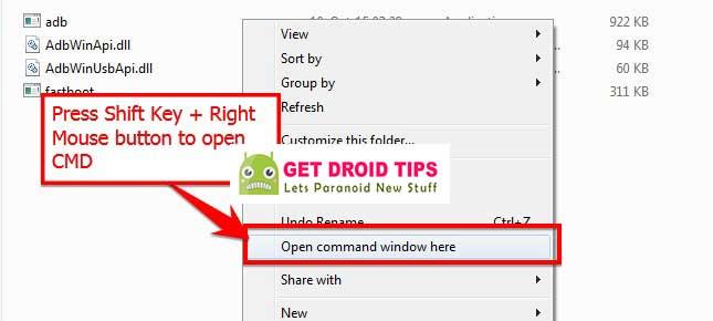 - Τώρα ανοίξτε το παράθυρο CMD (Παράθυρο εντολών) στον υπολογιστή σας από το φάκελο ADB Fastboot πατώντας παρατεταμένα Shift + δεξί κλικ του ποντικιού.