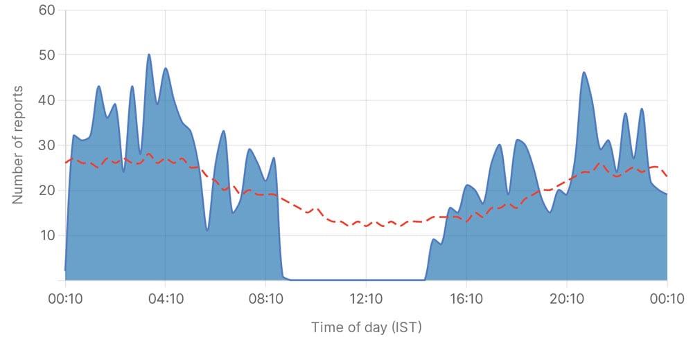 Το παρακάτω γράφημα αντιπροσωπεύει τον αριθμό των αναφορών που λάβαμε τις τελευταίες 24 ώρες σχετικά με το Instagram. Κάθε φορά που ο αριθμός των αναφορών υπερβαίνει τη βασική γραμμή (που αντιπροσωπεύεται από μια κόκκινη γραμμή), θεωρείται διακοπή λειτουργίας.