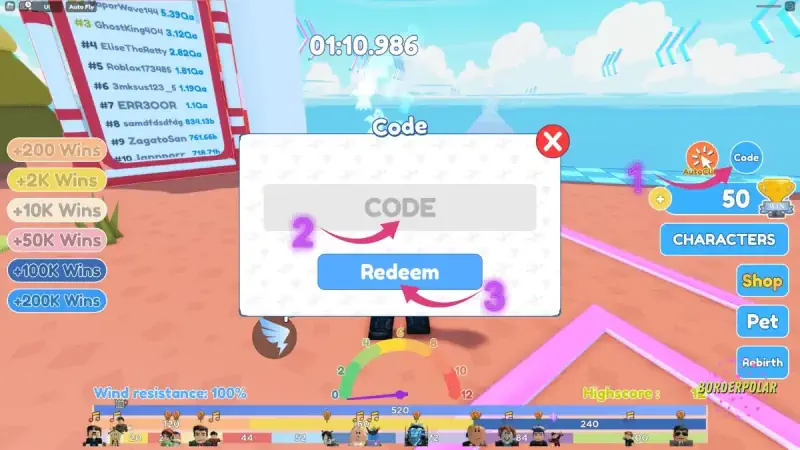 - Ξεκινήστε το παιχνίδι Flying Race Clicker. Κάντε κλικ στο μπλε κουμπί για να ανοίξετε το παράθυρο εξαργύρωσης κώδικα.