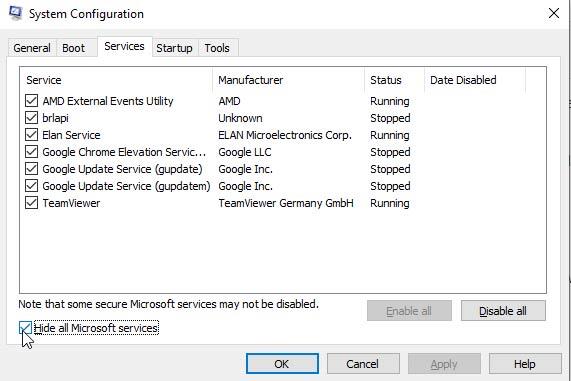 - Ahora, cambia a la Servicios pestaña, marque la casilla al lado Esconder todos los servicios de Microsoft, y golpea el deshabilitar botón seguido del OK. Luego, cierre la ventana de inicio limpio.