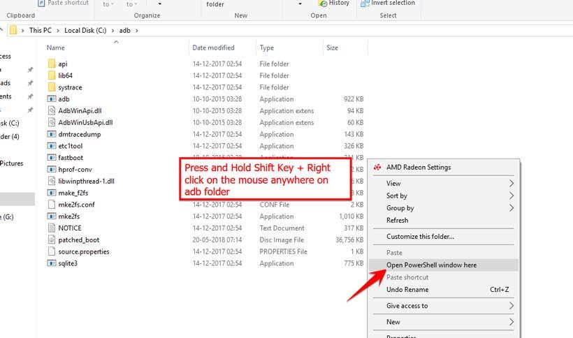 - Ezután nyissa meg az ADB & Fastboot mappát a számítógépen. Ezután nyomja le és tartsa lenyomva a Shift billentyűt, és kattintson a jobb egérgombbal a parancsablak megnyitásához.