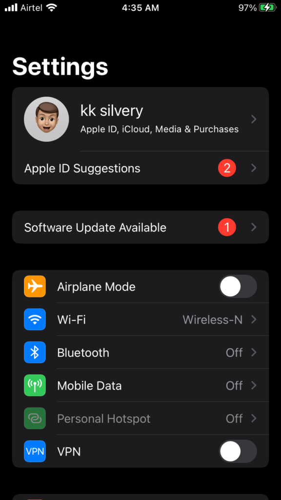 2. Érintse meg az Apple ID-t a Beállításokban.