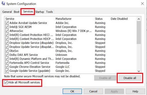 - Vou ao Serviços guia > Ativar o Ocultar todos os serviços da Microsoft caixa de seleção.